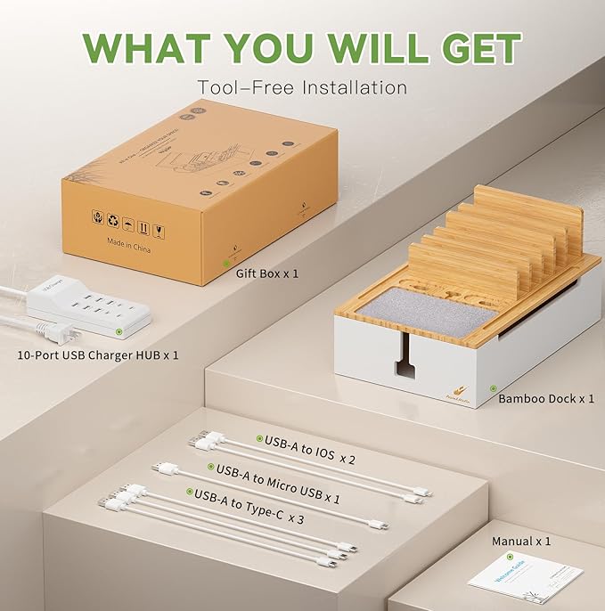 - What You Can Get: 1 x Pezin & Hulin Bamboo Charging Station, 1 x 10-Port USB Charger HUB & Cord, 6 x Short USB Cables (3pc Type-C, 2pc for lPhone & lPad, 1pc Android) for your daily use, 1 x user manual