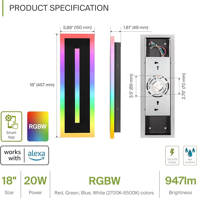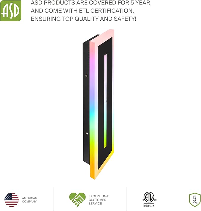 ASD LED 18" Long Wall Mount Light Fixture, Outdoor & Indoor Linear Sconce | RGBW, Smart, Waterproof, Anti-Rust, ETL Listed | 20W 950LM 2700-6500K 100-277V | Exterior Porch Lighting | Black