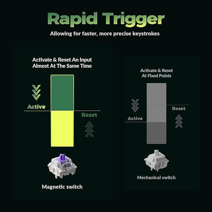 - Dynamic Rapid Trigger Trigger and reset each keystroke based on real-time travel distance, not fixed points. This ensures faster response and smoother control—essential for competitive FPS and action titles that demand quick reflexes."