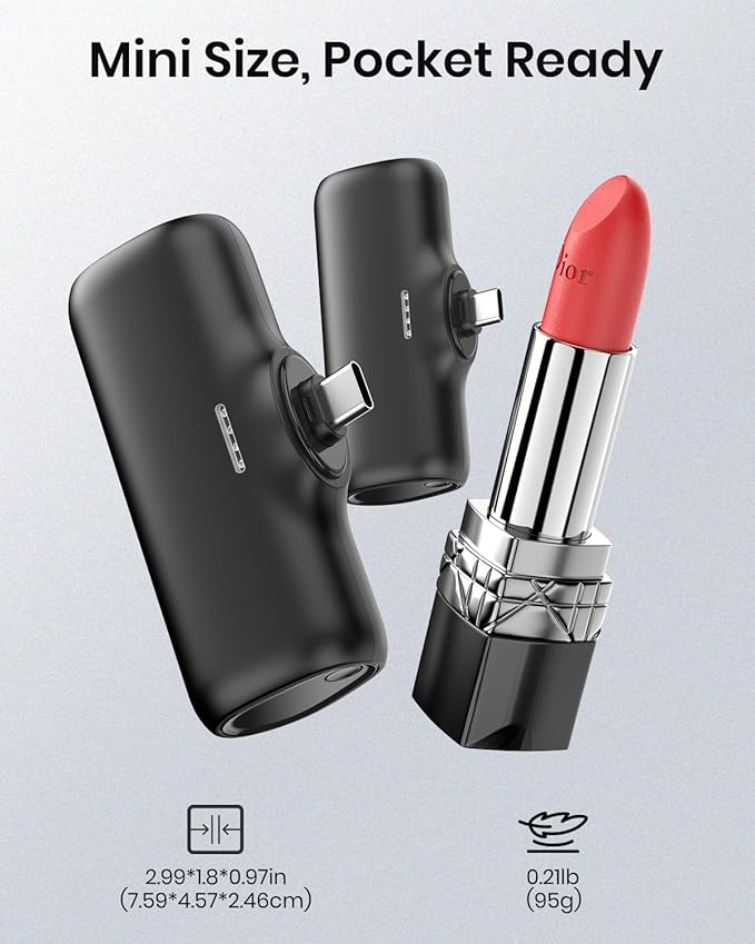 - 【Lipstick-Sized & Lightweight】The mini portable charger is as small and lightweight as a lipstick, making it extremely portable. Measuring just 7.59 x 4.57 x 2.46cm (2.99'' x 1.8'' x 0.97'') and weighing only 0.21 lbs, it easily fits into your pocket, makeup bag, or satchel. Say goodbye to bulky, hard-to-carry power banks and enjoy the convenience of this ultra-portable charger.