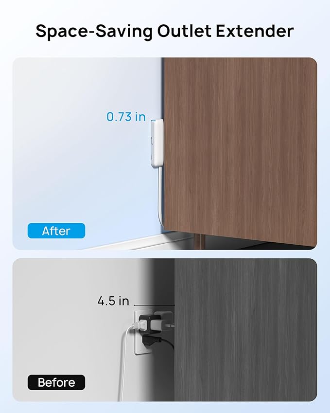 - Flat Extension Cord with Outlet Cover: TROND outlet concealer extension cord hides wall plugs completely, fixing the mess of wires and making the room tidy. Its slim and sleek design allows you to push furniture (beds, sofas, cabinets) flush against walls. So you won't have to sacrifice outlet access for furniture placement. Flat wall plug measured at 5.51" x 3.15" x 0.73", basically suitable for standard-sized wall plates