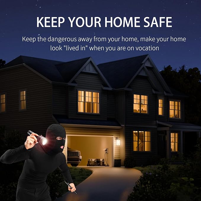 - KEEP YOUR HOME SAFE:With the integrated random function, The automatic timer for lights can turn on and off lights within the set time. It will keep any potential burglars guessing and keep your home safe while you are away.