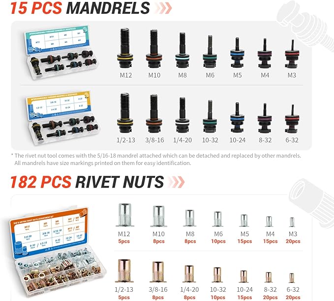 - Riv Nut Tool Kit: NOVORIK 16" rivnut tool kit comes with 15 mandrel sizes (M3, M4, M5, M6, M8, M10, M12; 6-32, 8-32, 10-24, 10-32, 1/4-20, 3/8-16, 5/16-18, 1/2-13), 182PCS rivet nuts and a portable storage. Please note that the riveter comes with the 5/14-16 mandrel attached.