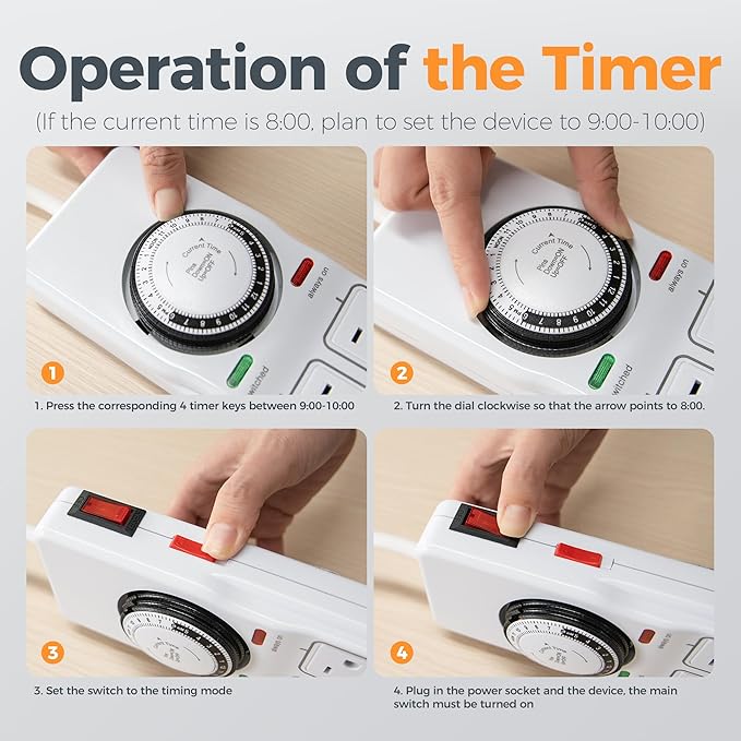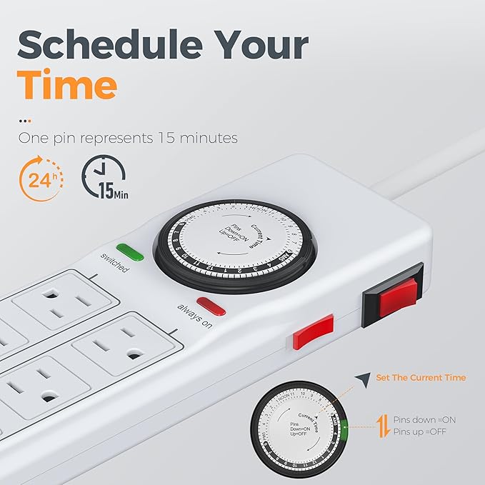 - Mechanical Timer Power Strip: The timer outlet can plan daily, equipped with 4 AC outlets for timing, 4 AC outlets are always powered, and can connect 8 devices simultaneously; The timer pin dial can be set in increments as low as 15 min
