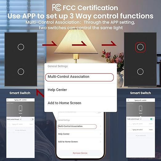 - 【A New 3 Way Control Method】After setting on the APP, three smart light switches can control the same light by touching switch. Setting steps: Select All Devices in the APP, click the corresponding switch, click the upper right corner to enter the new interface, find the Multi-Control Association to set it.This allows you to create a 3-Way circuit(2 switches control 1 light)