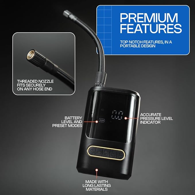 - ✅ Versatile Compatibility – Works as a bike tire inflator, tire pump for bike and car, and more with multiple nozzle attachments.