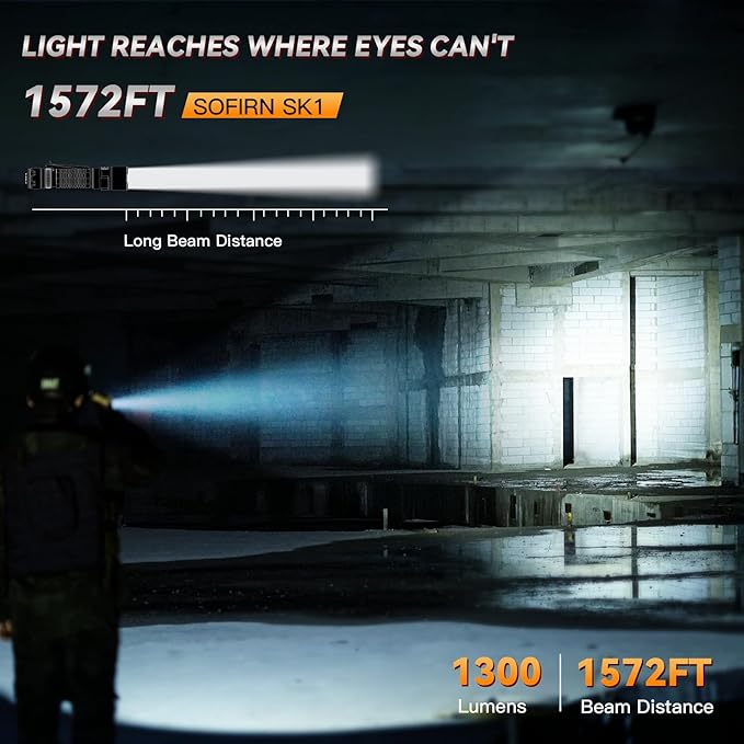 - Powerful LED Flashlight: SK1 has long range illumination and bright beam. This excellent flashlight has a beam range of up to 479 meters, which exceeds traditional flashlights. Its maximum brightness is 1300 lumens. SK1 bright flashlight is a good choice for hiking, tactical applications, and search and rescue.