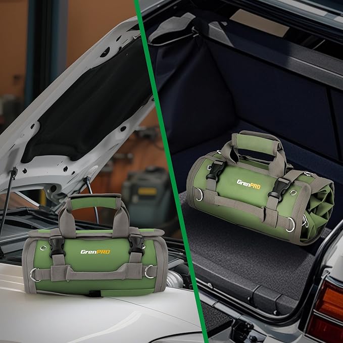 - Professional-Grade Tool Organization-Stay ahead with this roll up tool bag featuring 11 total compartments (4 large fixed slots, 2 detachable D-loop pouches, 5 exterior pockets). Perfect for wrenches, pliers, sockets, and small parts, it eliminates rummaging and saves 30% time on jobsites. The detachable pouches let you grab essential tools quickly, while the rolled design fits seamlessly in truck beds, motorcycle saddlebags, or garage shelves.