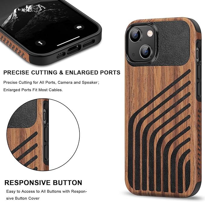 - Designed for iPhone 15 case: One-piece case consists of wood veneer, carbon fiber texture leather and TPU; 3 materials are synthesized; Carbon fiber texture leather and wood grain on the back and shock absorbent TPU rubber inside
