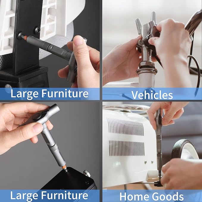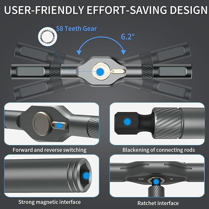 - Effort-Saving Ratchet Mechanism for Easy Operation: The 24 in 1 magnetic ratchet screwdriver set features a highly efficient ratcheting mechanism that reduces hand fatigue by up to 80%. With a 58-tooth forward-reverse ratchet, this tool allows for smoother and quicker screw tightening and loosening, making it ideal for both small and large projects.