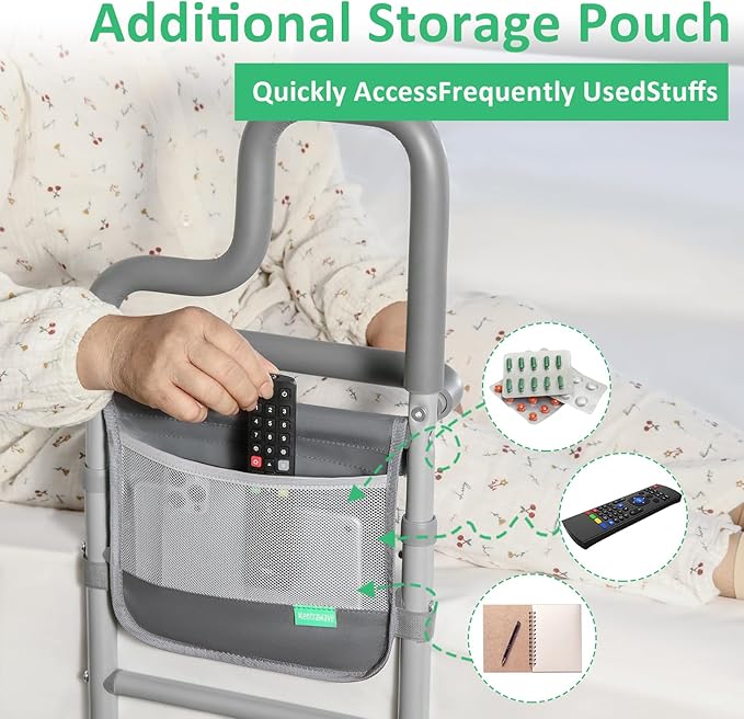 - Detachable Storage Pocket: The bed rails for elderly adults safety comes with a delicate storage pocket that allows you to quickly access frequently used items such as glasses, books, and medical supplies, making your sleep life easier.