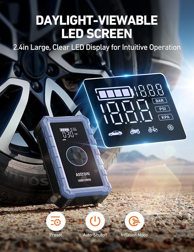 AstroAI S8 Air Jump Starter with Air Compressor, 1500A Peak Car Battery Jump Starter Portable (6.0 Gas/3.0L Diesel) with 150PSI Auto-Shutoff Tire Inflator, 12V Battery Charger Booster(Blue-Gray)