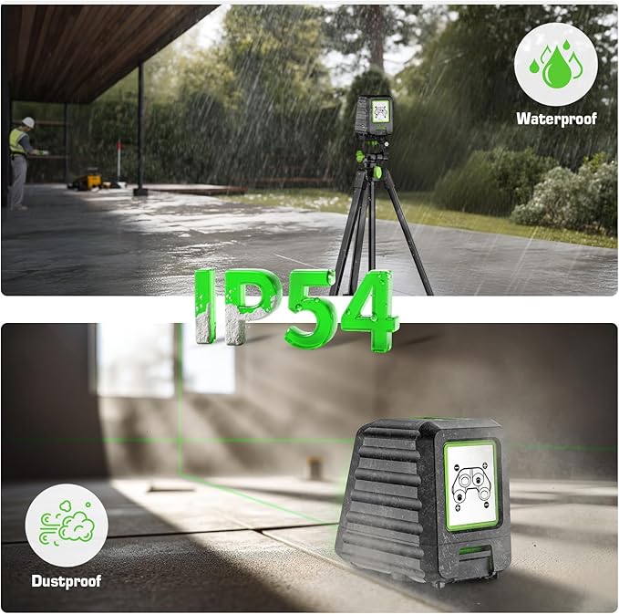 - 【150Ft Self-leveling Laser Level】Huepar BOX-1G 150 feet laser leveler will project a 130° horizontal line and a 150° vertical line when working, and equipped with a professional accuracy: ± 1/13In. at 33 Ft (±2mm at 10m). Laser level tool has bright green beam, soft grip and 47.2" drop protection, it's suitable for indoor and outdoor use. IP54 dust and water resistant, Safety Class II, 8 hour Single-line working time, 9 hour all beam line working time