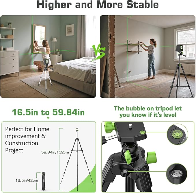 - 【Package Contents and Service Support】1X 150ft Laser Level, 1X 60in Laser Level Tripod, 4X AA Batteries, 1 X Green Laser Enhancement Glasses, 1X Laser Target Plate Card, 1X User Manual, 1X Carry-on Bag. If you have any questions, please feel free inform us, there is 24 months after sales service and our professional technology team will online for you at 24 hours