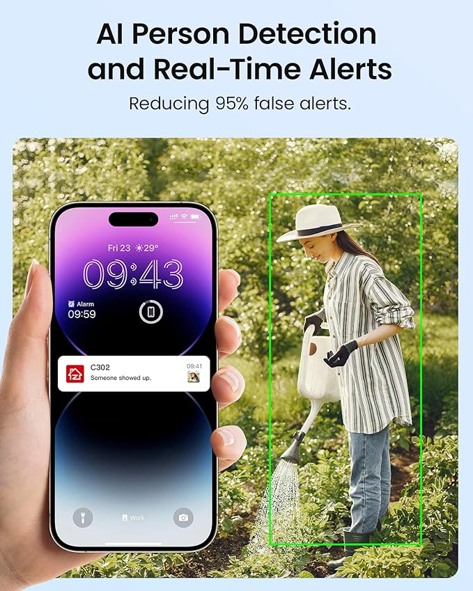 - 【Smart AI Human Detection】--Advanced AI-powered analytics accurately identifies people while filtering out pets, vehicles, and other false triggers. Get only relevant alerts and minimize unnecessary notifications for smarter security.Customizable detection zones ensure you only monitor important areas.
