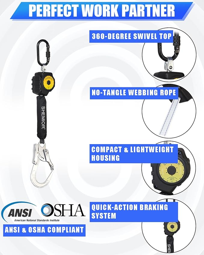 - 【PERFECT WORK PARTNER】This perfect SRL automatically retracts or extends based on the user's movement, allowing for free movement while maintaining constant tension on the lifeline. This feature minimizes the risk of stumbling, ensuring a quick response and 100% safety. You can put your heart and soul into your work without any worries or cares
