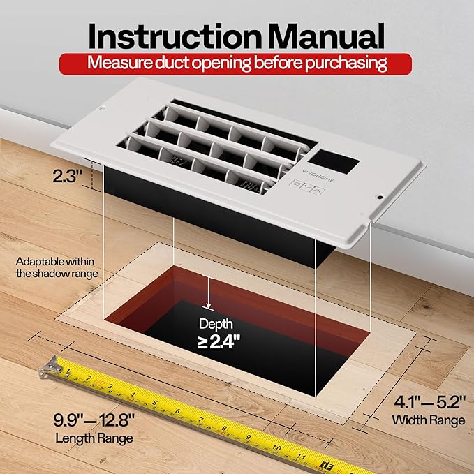 - ๐๐๐๐๐ ๐ ๐๐ ๐๐๐๐๐๐๐๐ ๐'' ๐ฑ ๐๐'' ๐๐๐๐๐: Designed specifically for 4'' x 12'' vent openings to ensure a snug, secure fit; Compatible with vent sizes ranging from ๐.๐''โ๐๐.๐'' ๐ข๐ง ๐ฅ๐๐ง๐ ๐ญ๐ก, ๐.๐''โ๐.๐'' ๐ข๐ง ๐ฐ๐ข๐๐ญ๐ก, and no less than ๐.๐'' ๐ข๐ง ๐๐๐ฉ๐ญ๐ก; When selecting a register, refer to ๐๐ต๐ฒ ๐ฎ๐ฐ๐๐๐ฎ๐น ๐ฑ๐ถ๐บ๐ฒ๐ป๐๐ถ๐ผ๐ป๐ ๐ผ๐ณ ๐๐ต๐ฒ ๐ฑ๐๐ฐ๐ ๐ผ๐ฝ๐ฒ๐ป๐ถ๐ป๐ด in your floor, wall, or ceilingโnot the size of the vent cover