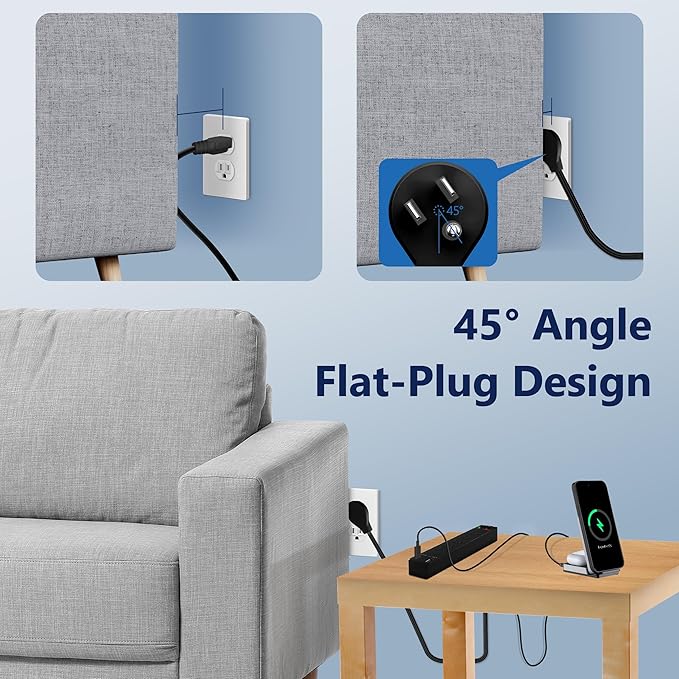 - Ultra-Thin Flat Plug for Space-Saving Convenience — The 0.33-inch ultra-thin plug with a 45° angle design ensures easy access to wall sockets without blocking adjacent outlets, making it perfect for tight spaces behind furniture, desks, or appliances.