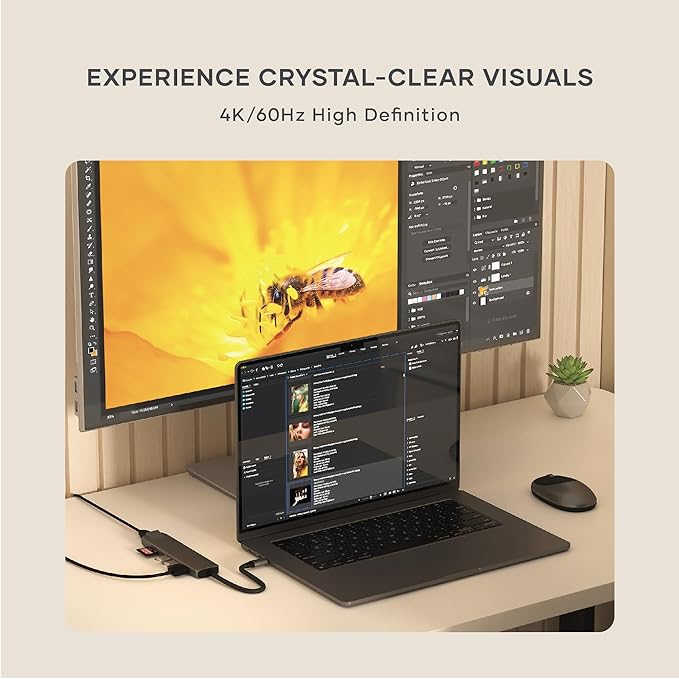 - Crystal-Clear 4K Connectivity – Unlock stunning 4K @ 60Hz video output by seamlessly connecting an HDMI 2.0 or higher cable to the USB-C hub. Enjoy crisp, vivid visuals—perfect for streaming, presentations, or extending your workspace with ultra-high-definition clarity.