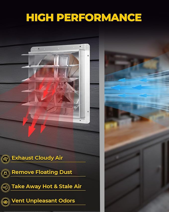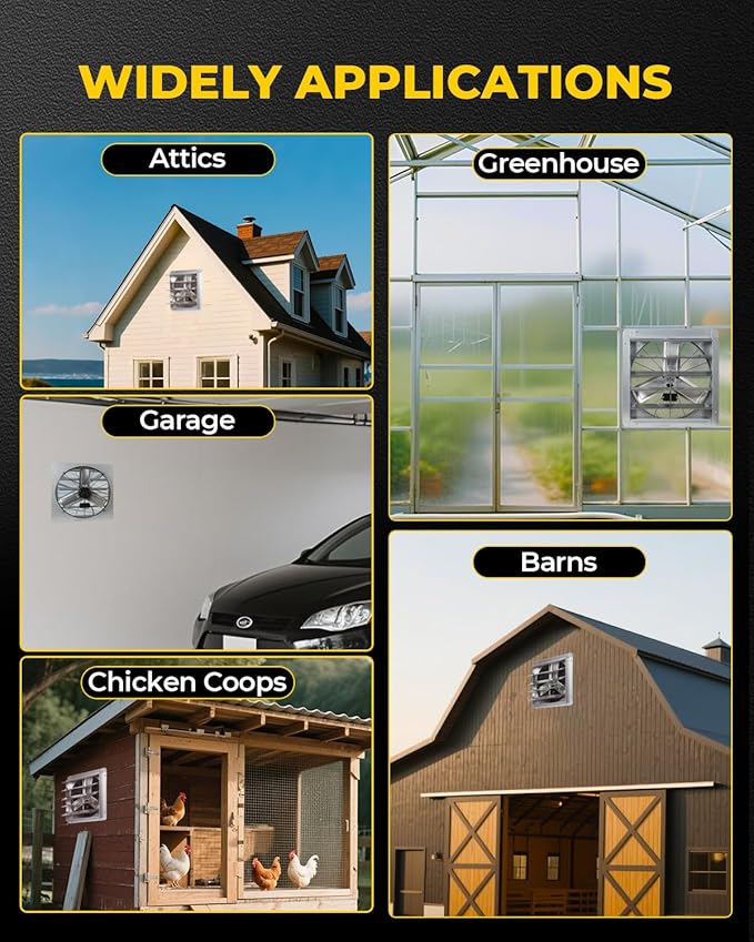 - Heavy-Duty Airflow for Large Spaces; 4200 CFM airflow rapidly removes heat, dust, humidity, and odors. Ideal for garages (vehicle exhaust), greenhouses (heat regulation), attics (heat reduction), and workshops (dust extraction), and chicken coops (ventilation).
