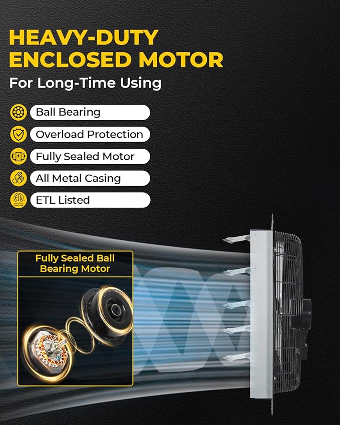 - Industrial-Grade Metal Durability: VENTISOL exhaust fan crafted with dual-layer galvanized steel body with rust-resistant aluminum alloy shutters withstands corrosion and humidity, high temperatures (-30°F to 140°F), and harsh environments. ETL-Certified for safety.