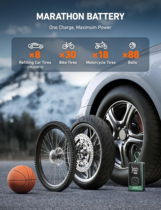 - LONG ENDURANCE, MORE INFLATION: Once fully charged, it can refill 8 car tires, or inflate 30 bike tires, 88 balls, or 18 motorcycle tires. Its intelligent battery management system monitors the power in real-time, making it perfect for long trips, outdoor activities, and daily commuting