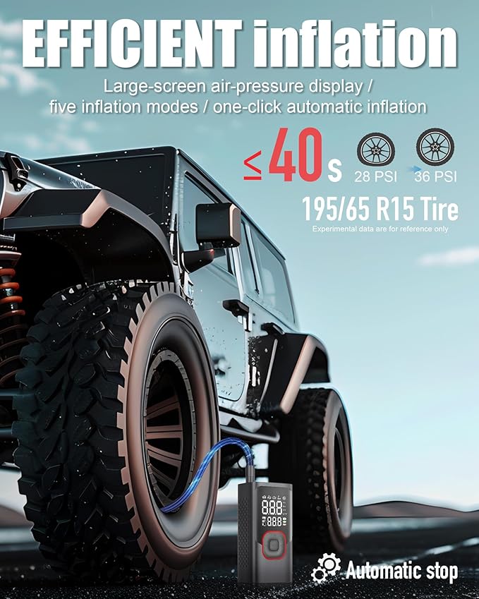 - 6X FASTER tire Inflator portable air compressor: For faster inflation, the air compressor has a maximum pressure of 150 PSI, plus 35L/min airflow, which increases the inflation speed by 6 times, it can inflate 195/65R15 tires from 29 PSI to 36 PSI in less than 1 minutes. Ideal for car, bike, and motorcycle tires