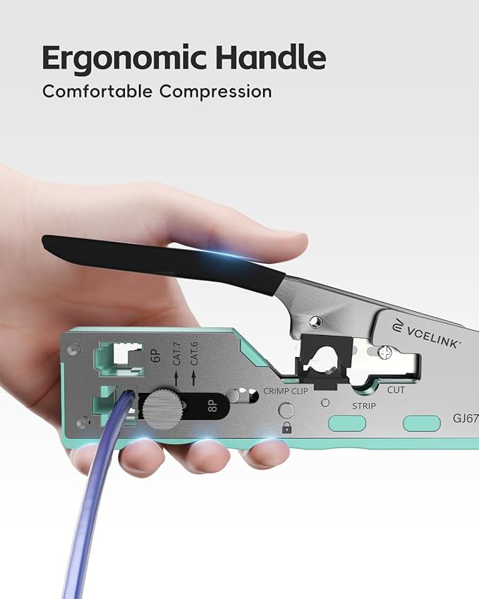 VCELINK RJ45 Crimp Tool, All-In-One Ethernet Crimper for CAT7/CAT6A/CAT6/CAT5E/CAT5, No Screwdriver Needed RJ45 and RJ11/RJ12 Crimping Tool, with An Adjustable Knob, Green