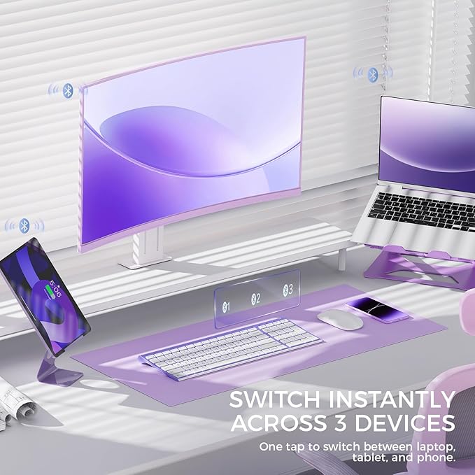 - Keyboard Description : Slim, compact Bluetooth keyboard with chic lavender top and soft white keys, quiet low-profile scissor-switch keys (<50 dB), 3-device pairing with quick-switch buttons, and 99-key US QWERTY layout — perfect for stylish home offices and aesthetic desk setups Slim, compact Bluetooth keyboard with chic lavender top and soft white keys, quiet low-profile scissor-switch keys (<5… See more