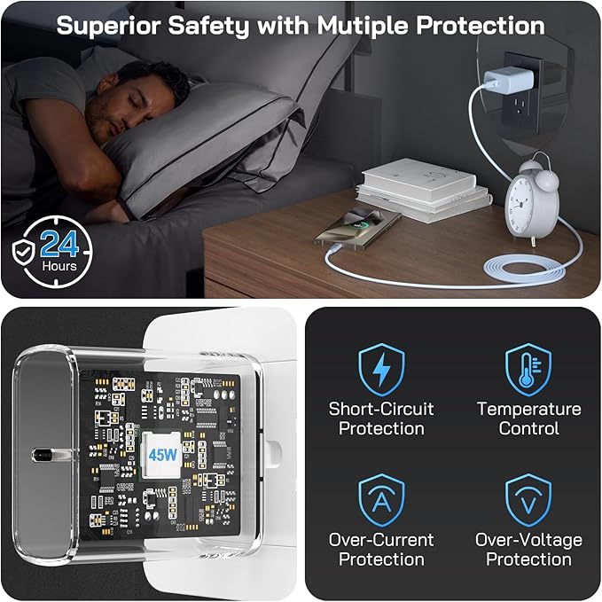 - 【What's Included】45W USB-C Charger Block x2, 6.6FT Type C to Type C Charger Cord for Samsung Phone x2, backed up by our worry-free 12-month warranty and 24/7 friendly customer support.
