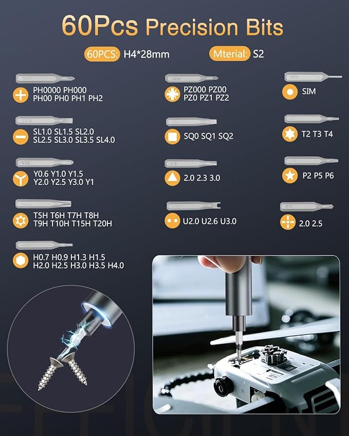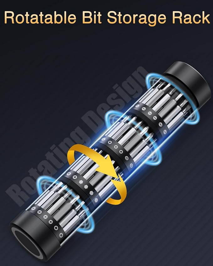 - Rotatable Bit Organizer: Semi-concealed 360° rotating rack stores 60 Precision bits in the most space-efficient way possible. Each bit is labelled according to its type, so you can enjoy efficient repairs without struggling to find the bit you need