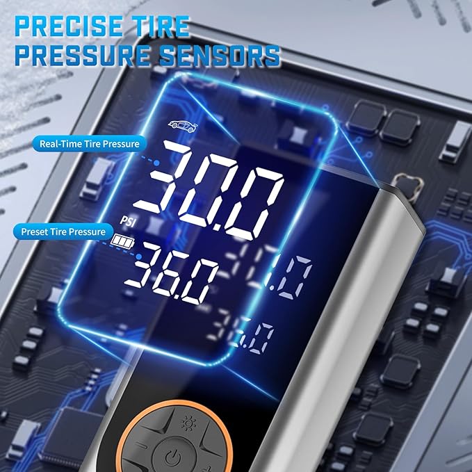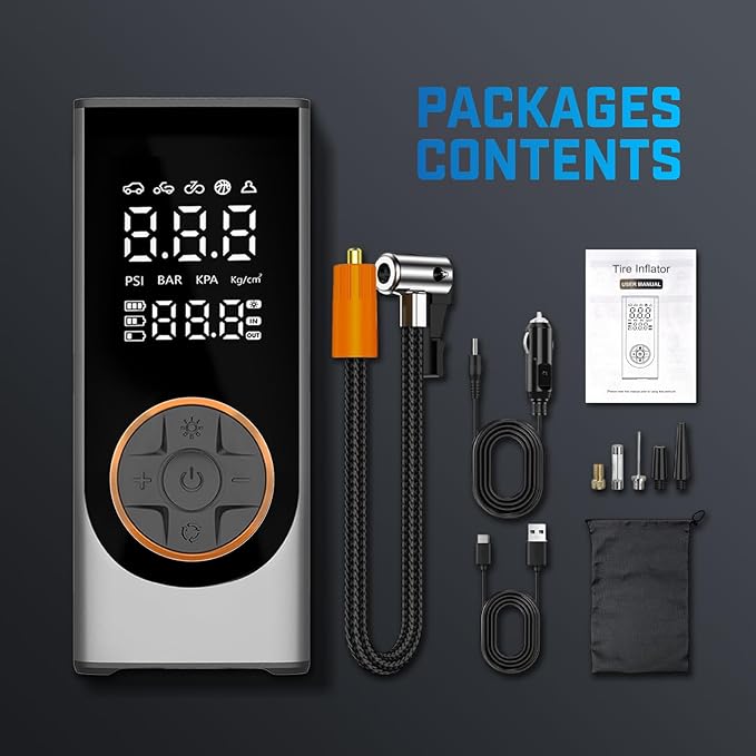 - โจ Accurate Dual Pressure Display: Featuring a clear display screen, the portable air compressor shows real-time and preset pressure values, automatically shutting off when the preset pressure is reached. Four pressure units: PSI, KPA, BAR, KG/CMยฒ.