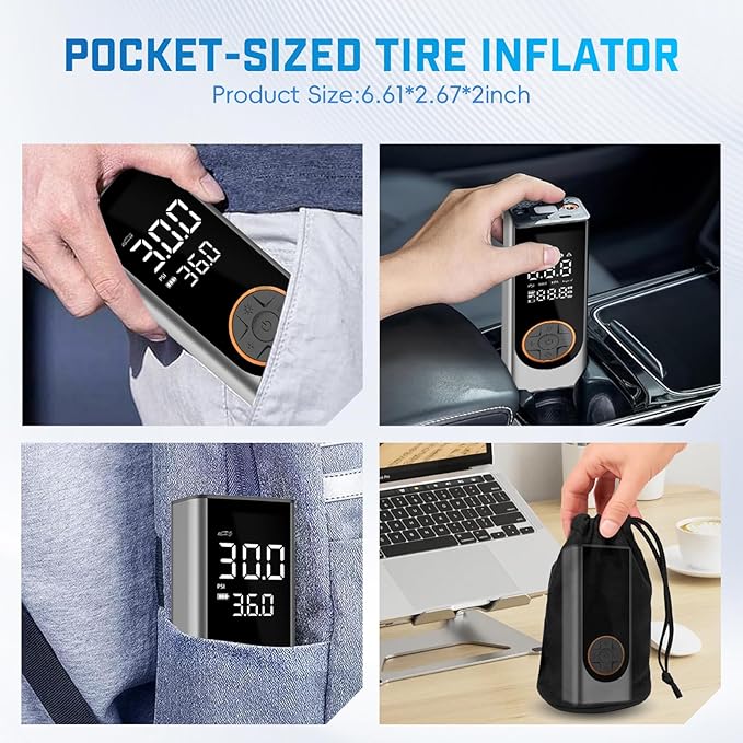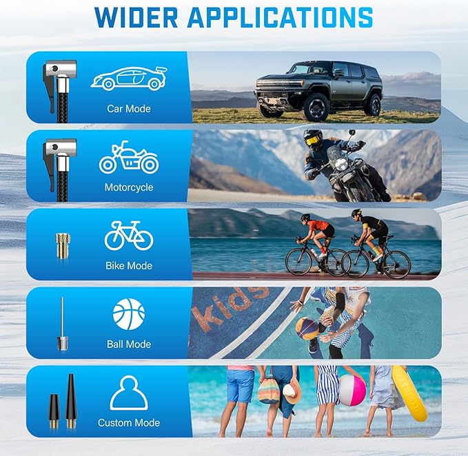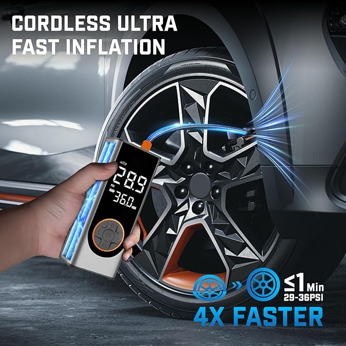 - ๐ 4X Fast Inflation & 5 Modes: This tire inflator portable air compressor delivers a maximum 150 PSI & 35 L/min airflow, inflating a car tire (29-36 PSI) in under 1 min. Features 4 preset modes: car, motorcycle, bike, and ball.