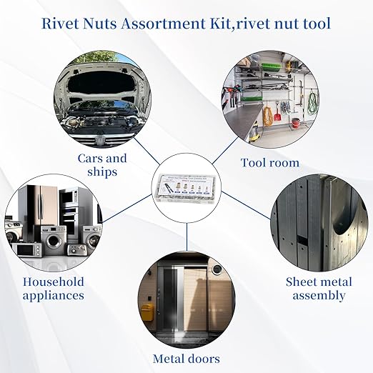 - 【Riv Nut Tool Kit Wide Application】The threaded insert rivet machine tool kit is suitable for outdoor metal fences, metal doors and windows, home appliances, auto repair, furniture, home decoration, sheet metal assembly and industrial applications. Truck walls, RVs and homes, metal processing fixation, bicycles, off-road, metal cover fixation modification of house roofs and other occasions to add bolted accessories to metal, fiberglass and other workpieces. It is the preferred rivet nuts assortment kit for industrial processing accessories