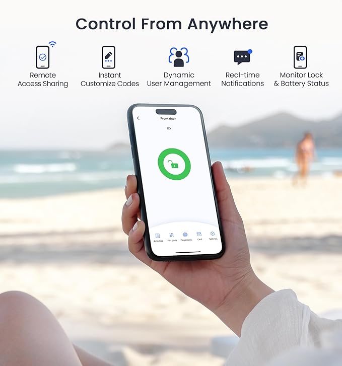 - 6-in-1 Key-Free Locking: Auto-Lock in 10–180s as customized. Lock quickly with Voice Commands, Fingerprint, remote App control, by simply pressing any key for 2 seconds, or by tapping the “✔” on the touchscreen.