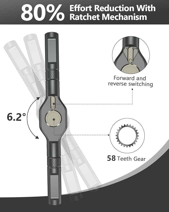 - 【Effortless Ratcheting Mechanism for Fast Repairs】58-tooth gear system with 6.2° ratchet angle reduces effort by up to 80%; delivers 50N·m torque for smooth forward/reverse switching – the ultimate ratchet screwdriver set for quick, wrist-friendly performance