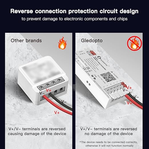- 20A Total Current Output with Reverse Polarity Protection: Capable of driving RGB + CCT (dual white) LED strips with a robust 15A max output, ideal for long high-density installations. Features built-in reverse connection protection to prevent damage from wiring errors