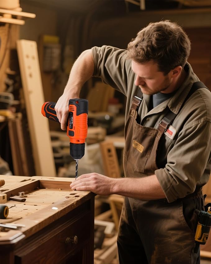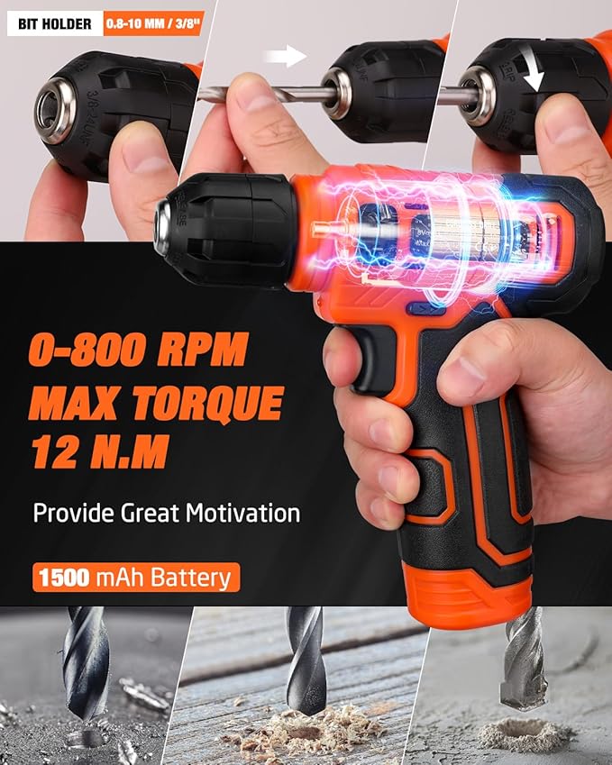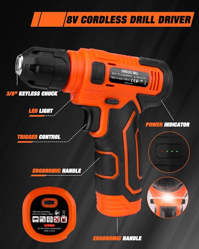 - 8V Power Cordless Drill with LED: Featuring a compact, ergonomic design, this drill boasts a non-slip grip for secure handling. Its lightweight build enhances maneuverability, while adjustable speed settings (up to 800 RPM no-load speed) adapt to varied applications. The integrated LED light ensures visibility in low-light conditions