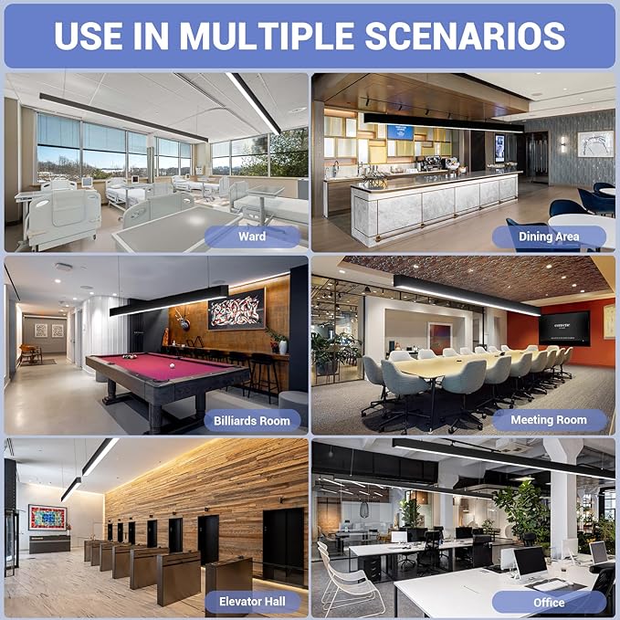 - DIRECT AND INDIRECT LIGHT:LED linear light fixture is innovated with 100/90/80/70/60W down light and 100/90/80/70/60W up light. The down light provides sleek focused lighting and the up light creates a nice ambiance and reduce eye fatigue, perfect for office, work bench, work shop, garage, gym, school, exhibition, bar,and even pool tables.