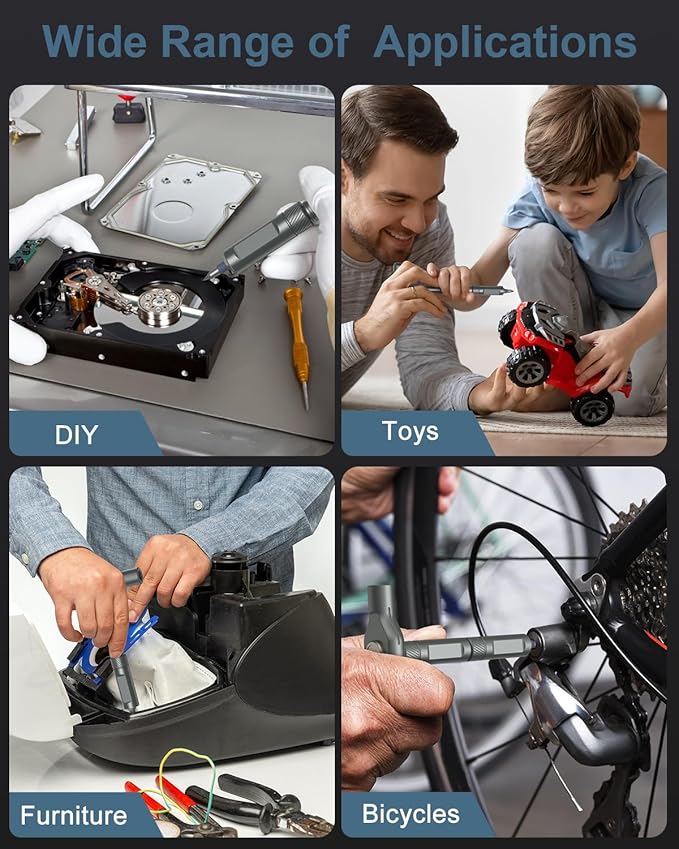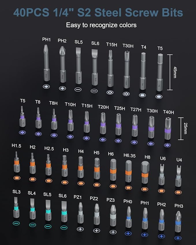 - Multipurpose and All-Inclusive: The Ankilo magnetic screwdriver kit contains 40 S2 magnetic chrome molybdenum steel bits (6.35mm diameter), comprising 32 short 25mm bits (PH, SL, Torx, Hex, PZ, u-shape) and 8 extended 45mm bits. Suited for diverse applications including household tasks, DIY projects, bicycle maintenance, and expert repairs