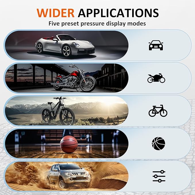 - ✅【Accurate Detection & Memory Function】: The upgraded multi-functional tire inflator is equipped with an automatic shutdown function to ensure accurate inflation, prevent the tire from being over/under inflated, and automatically stop inflation after reaching the preset pressure. The last used pressure value will be saved when inflating, and no adjustment is required for the next use, which is more convenient.