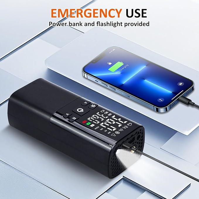 - ✅【Portable Design】: This portable air compressor adopts a compact wireless design and is small in size, which can be easily put into your car or backpack, ready for any emergency inflation task. The built-in LED light has three modes (SOS, constant light, strobe) to ensure that you will never be trapped in the dark. Equipped with a powerful 16000 mAh battery, this air compressor can also double as a mobile power bank, allowing you to charge your devices anytime, anywhere. It is a must-have product for drivers, cyclists and explorers.