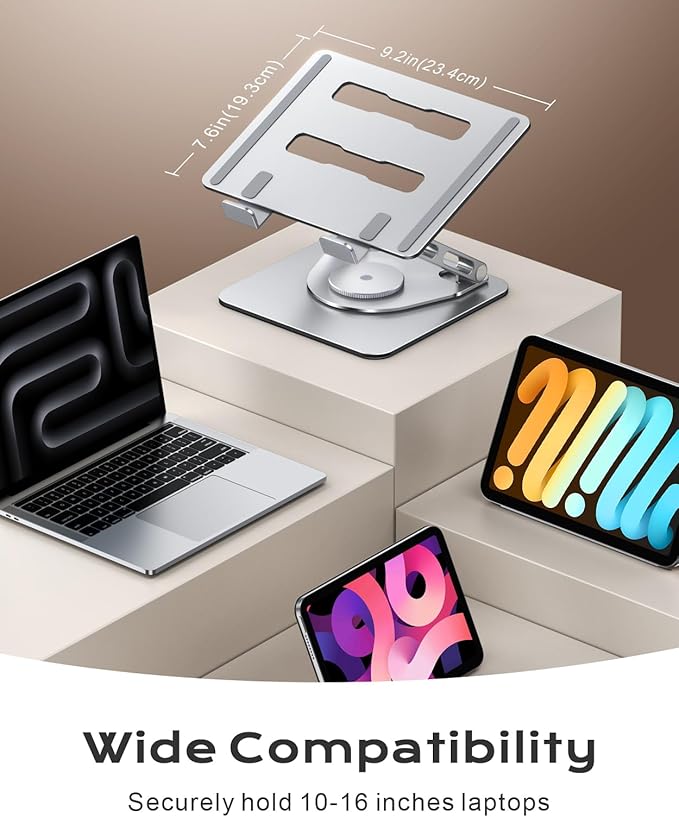 - [360° Flexible Rotation] Experience unparalleled versatility with the RIWUCT laptop stand, featuring a 360° rotation on its base for infinite positioning possibilities. Perfect for personal second screens, cooking, group projects, or meetings, offering optimal working positions.