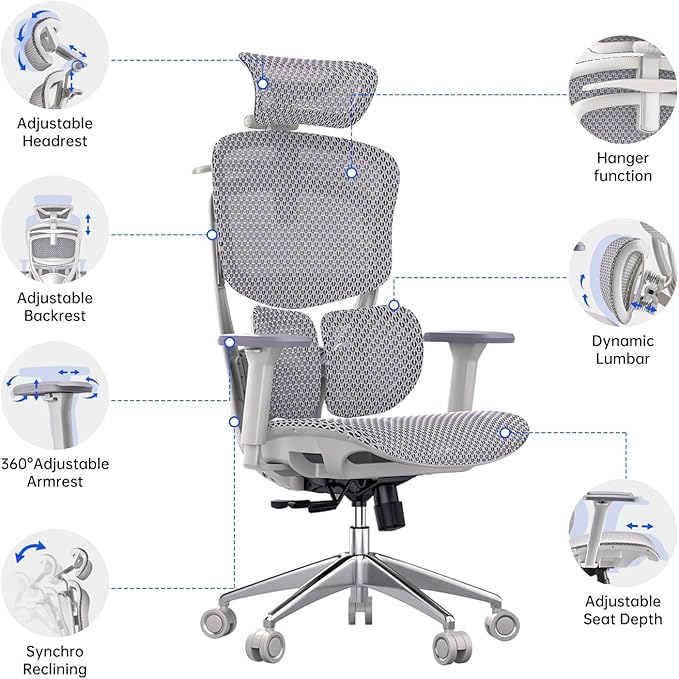 ERGOUP Ergonomic Office Chair - Full Mesh Backrest, 4D Adjustable Headrest, 360° Rotating Armrests, Gray - Premium Support for Professionals, Gamers & Home Office Users