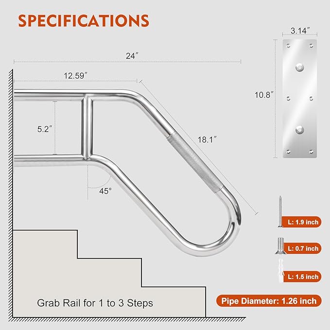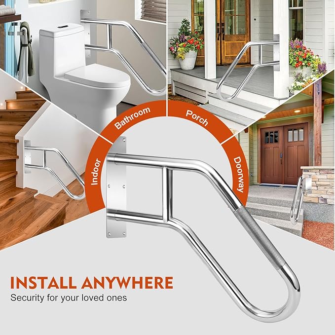 - Easy Installation for Versatile Environments: This handrails all necessary installation accessories are included, allowing for setup in just minutes. Suitable for various wall surfaces such as wood, tiles, and concrete. It is perfect choice for both indoor and outdoor environments like garage entrances and patios etc