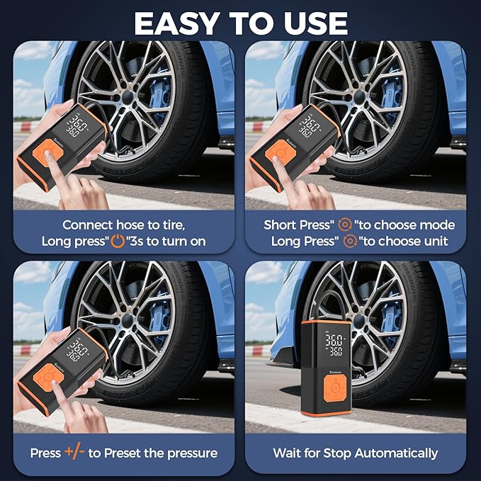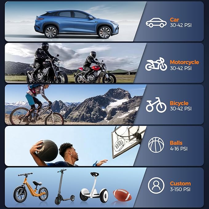 - Tire inflator portable air compressor: This air compressor has 5 preset modes. You can also switch to custom mode and input the pressure you want to inflate. Equipped with 4 different nozzles and 1 pressure mode: PSI, suitable for cars, bicycles, motorcycles, balls, etc. The display screen can show real-time tire pressure and power.