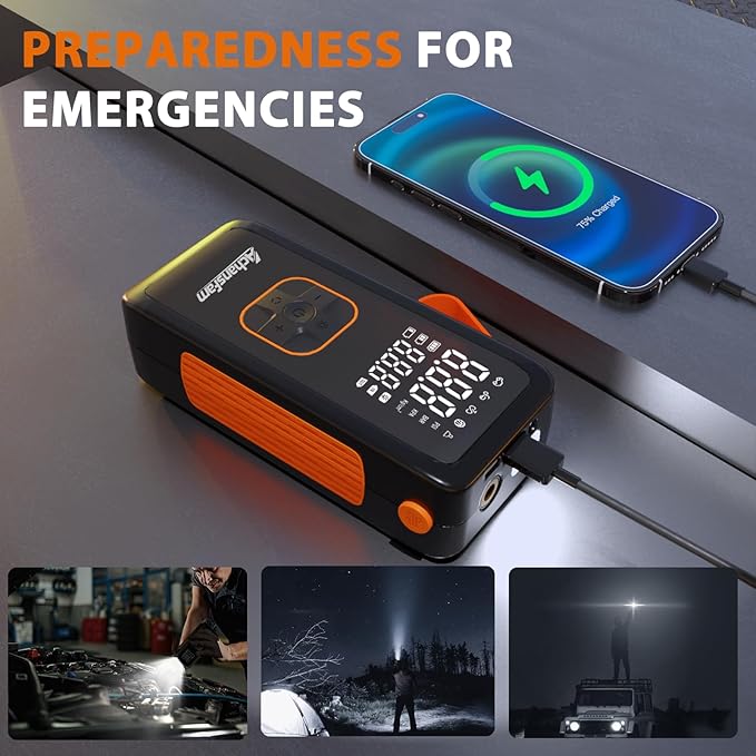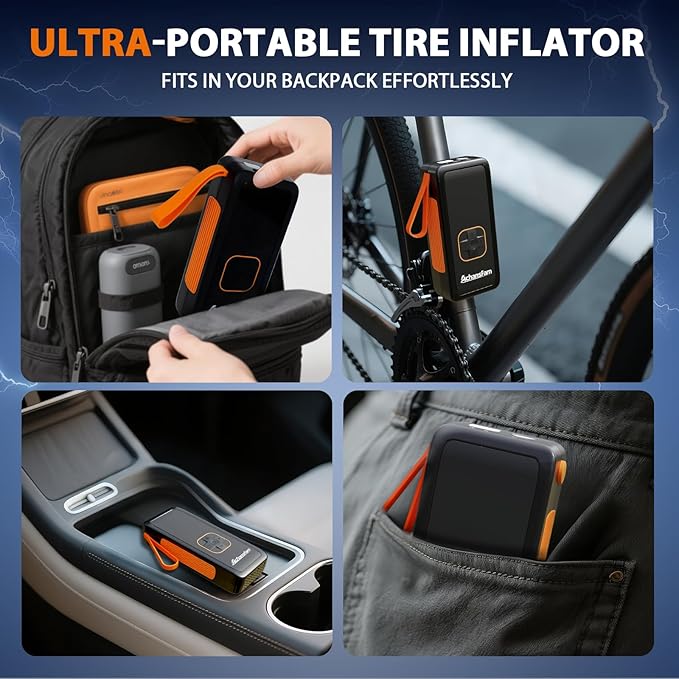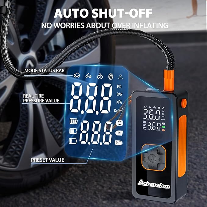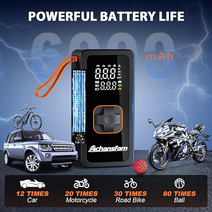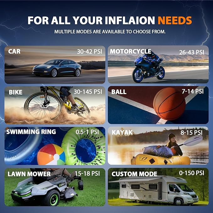 - [๐๐ฆ๐๐ซ๐ญ ๐๐ซ๐๐ฌ๐๐ญ๐ฌ] Four preset modes for bicycles, motorcycles, cars, and balls, with a high-definition digital pressure gauge (accuracy ยฑ1 PSI) for safe inflation. Equipped with three lighting modesโLED, SOS, and strobeโfor nighttime use and emergencies. You can also set custom pressure values up to 150 PSI to meet various inflation needs.