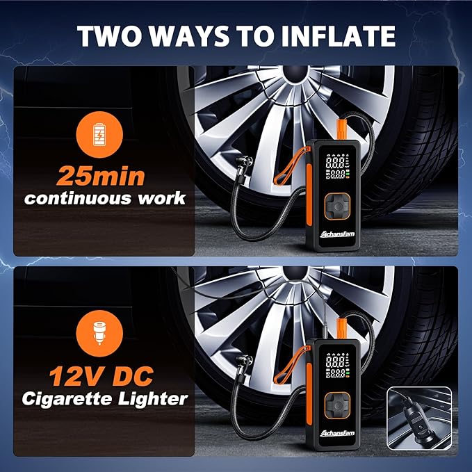 - [๐๐ฎ๐๐ฅ ๐๐จ๐ฐ๐๐ซ] Powered by a built-in 22.2Wh high-capacity battery, it can run continuously for 2-3 hours and fully recharges in about 3-4 hours. Dual power options: cordless operation or car power cable connection. Simply plug into the carโs cigarette lighter for uninterrupted inflationโno delays on your journey! (Tip: Keep the power cable in your car for emergencies!)