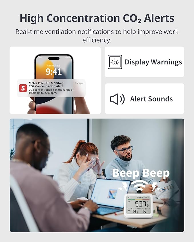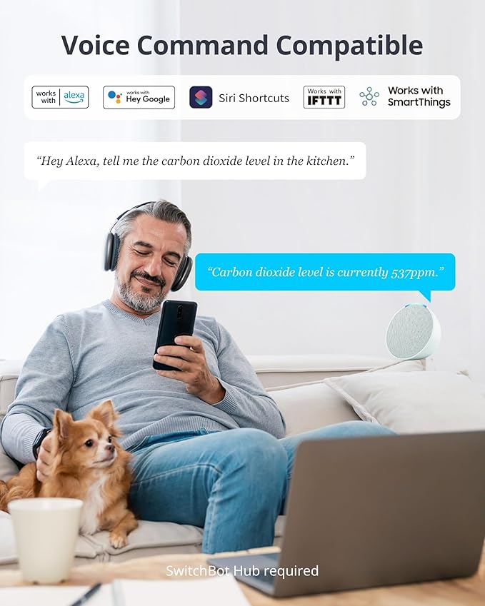 - 3 Alarm Methods: Customize CO2, temperature, and humidity range with trigger alerts. When limits are exceeded, you'll be notified via sound alarms, visual screen alerts, and app notifications (SwitchBot Hub required). With this air quality monitor, you can continuously and effectively track air quality.