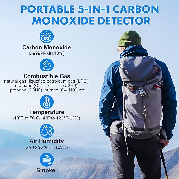 - 【5-in-1 Upgraded Carbon Monoxide, Smoke and Natural Gas Detector】This Chyuuie 5-in-1 carbon monoxide and propane gas detector integrates carbon monoxide, combustible gas, smoke, temperature and humidity sensors, which is easy to carry around and detects gases in the environment in real time to ensure our safety.The built-in 1000 mAh rechargeable battery ensures that this smoke and carbon monoxide alarm will continue to work in the event of a power outage.